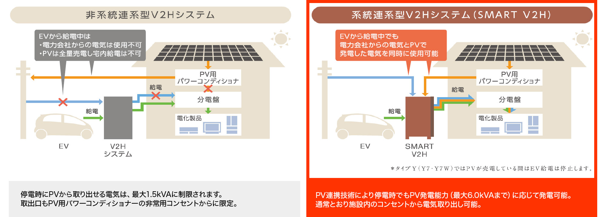 系統連系型のSMART V2Hなら停電時でもEVからの給電に加え、太陽が照っていればPVからEVへの再充電が可能なので、停電の場合でも安心です(自立運転時PV連携技術)。