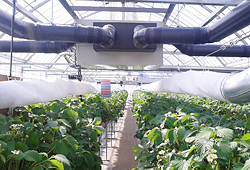 日本海側でのイチゴの促成栽培で、低温で日長の短い冬期に株の矮化を防ぐ目的でLEDによる電照試験を行っています。光源の波長(赤、青、遠赤)の割合を変えることで葉の成長や光合成の促進を図り、糖度の向上を目指しています。
